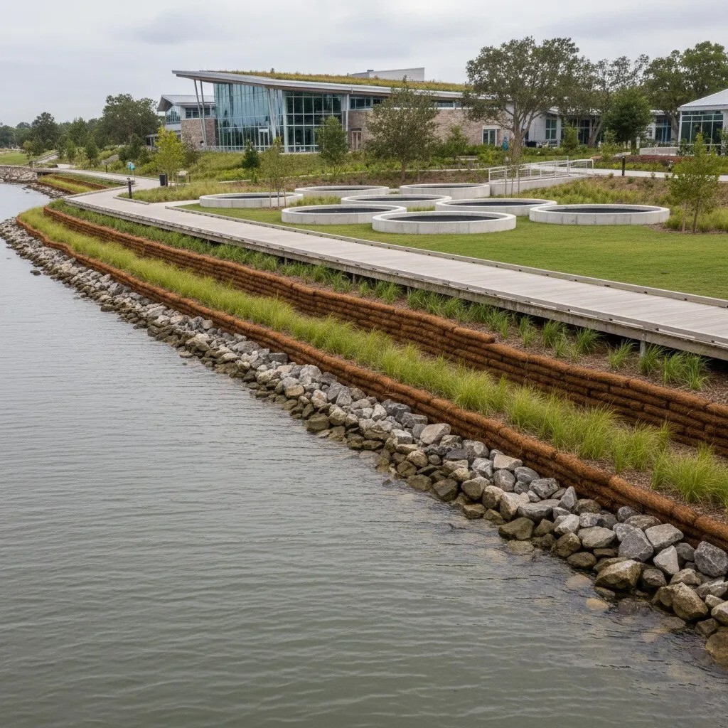 Living shoreline and stabilization solutions installed in partnership with SOX Erosion Solutions™ to reduce erosion, protect waterways, and preserve landscaped areas.